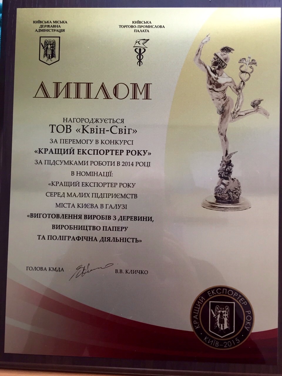 Ура! Наши труды заслуженно оценили! 22 декабря 2015 года, Мэр города Киева - Виталий Кличко, вручил компании «Квин-Свиг» диплом за победу в конкурсе «Лучший экспортер года» в номинации: «Лучший экспортер года среди малых предприятий города Киева в области «Изготовление изделий из древесины, изготовление бумаги и полиграфическая деятельность». К бумаге и полиграфии мы отношения не имеем, но деревянные окна и двери мы делаем отличного качества :)