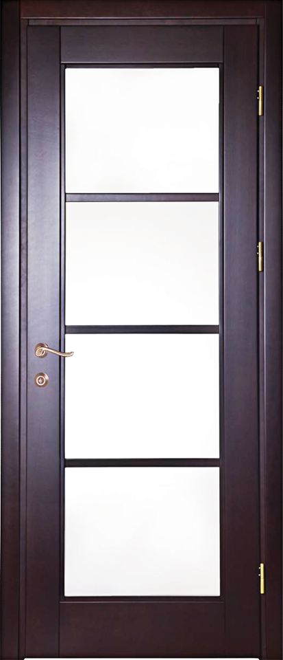 - Полотно и коробка состоит из массива дерева, с ярко выраженной (ясень, дуб) и менее выраженной (ольха) структурой, влажностью 10-12%, получаемого в процессе склеивания под высоким давлением брусков из тщательно высушенной древесины. Бруски имеют разное направление волокон в каждом слое, что обеспечивает конструкции дверного блока высокое качество;
